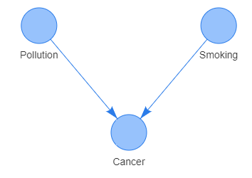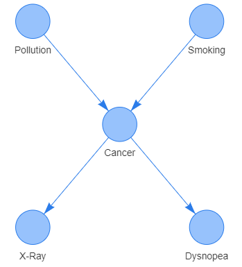 Dependencies between nodes (random variables) in Bayesian Networks are indicated by directed edges. A directed edge between two nodes \(A\rightarrow B\) displays the direction from the cause to effect (symptom). Shown in the graph below is the dependency between the symptom of having cancer and a possible causes of high pollution and smoking habit. Noteworthy that all direct dependencies are represented by arcs.